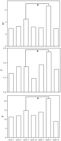 Shannon–Wiener diversity (H′), Pielou evenness (J′), and Marglef richness (d) in the Huayanghe Lakes (* p < 0.05).