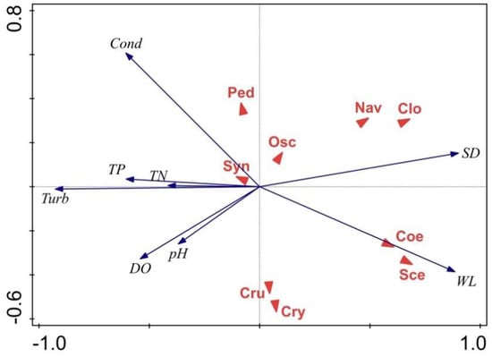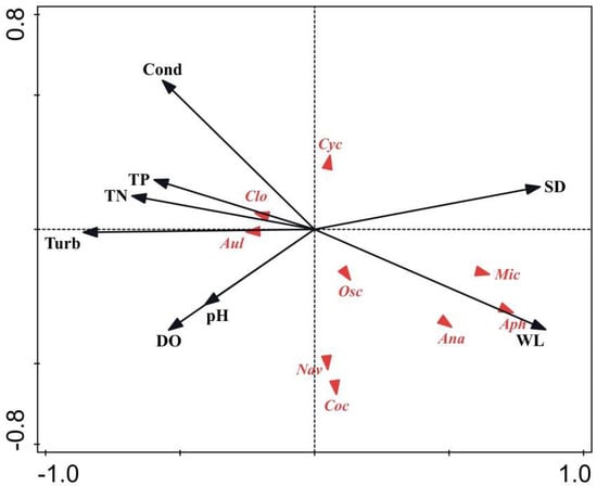RDA was used to evaluate the relationship between phytoplankton dominant species and environmental factors. The RDA ranking diagram includes dominant phytoplankton species and environmental variables. The eigenvalues for RDA axis 1 (0.573) and axis 2 (0.069) explained 59.25% of the variance in the phytoplankton functional groups during the extreme hydrological cycle (Table 1). However, the eigenvalues of the first two axes (0.433 and 0.034, respectively) of the RDA only explained 46.73% (Table 2) of the variance in the phytoplankton taxonomic communities during the regular hydrological cycle (Figure 6). We found that pH, WL, SD, Cond, DO, Turb, TN, and TP were the main factors that affected the phytoplankton taxonomic composition.