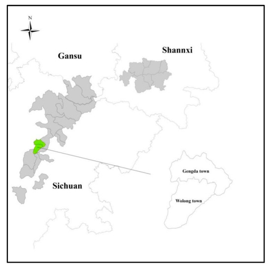 The Giant Panda National Park spans the Sichuan, Shaanxi, and Gansu provinces. It encompasses 30 counties (cities and districts) in 12 cities (states) and integrates more than 80 nature reserves of various types, making it the Chinese national park with the largest number of provinces, the largest population, and the largest number of reserve types [59]. The park consists of the Minshan Area in Sichuan Province, the Qionglai Mountain-Daxiangling Area, the Qinling Area in Shaanxi Province, and the Baishuijiang Area in Gansu Province. It covers an area of 27,134 square kilometers, of which Sichuan Province accounts for about 74.4%. The Giant Panda National Park is the first national park in China to be established with a single species at its core and integrated into its main habitat. The park has preserved 180,560,000 square kilometers of giant panda habitat, is 70.08% of the country’s total giant panda habitat area, and contains 1631 wild pandas, which is 87.50% of the country’s total. This makes it a world biodiversity hotspot, and its establishment has provided an important guarantee to expand protected areas and create a strong conservation system [60]. Wolong Nature Reserve is part of the Giant Panda National Park and is located in the southwest of Wenchuan County, Aba Tibetan and Qiang Autonomous Prefecture, Sichuan Province. Its longitude is 102°52′–103°25′ east, and its latitude is 30°–31°25′ north. It is 60 km wide, from east to west, and 63 km long, from north to south, spanning Wolong and Gengda townships, and is the largest nature reserve in Sichuan Province, with the most complex natural conditions and the highest number of rare animals [61]. The research area is shown in Figure 2.