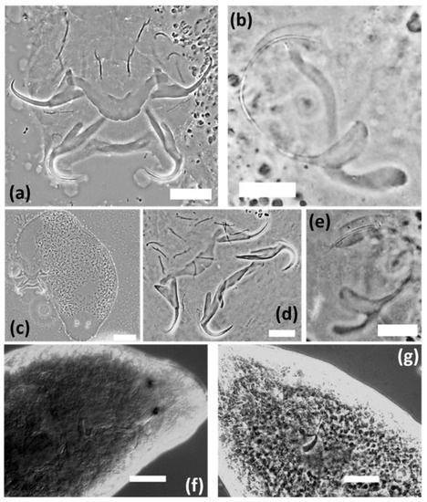 Micrographs of Xenoligophoroides cobitis. (a) Haptoral hard parts, specimen from Acheloos Delta. (b) Male copulatory organ, specimen from Acheloos Delta. (c) Whole mount, specimen from Acheloos Delta. (d) Haptoral hard parts, specimen from Kryoneri Estuary. (e) Male copulatory organ, specimen from Kryoneri Estuary. (f) Photo voucher of temporarily water-mounted specimen from Acheloos Delta. (g) Photo voucher of temporarily water-mounted specimen from Kryoneri Estuary. Both photo vouchers show the characteristic “bilobed” (sensu Sasal et al. [16]) or “two-chambered” base (sensu Dmitrieva et al. [17]) of the male copulatory organ of X. cobitis. Scale bars: 50 µm (c), 20 µm (a,d,f,g), 10 µm (b,e).