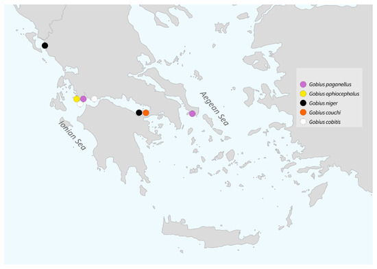 - Vanhove, M.P.M.; Economou, A.N.; Zogaris, S.; Larmuseau, M.H.D.; Giakoumi, S.; Kalogianni, E.; Volckaert, F.A.M.; Huyse, T. Phylogenetics and biogeography of the Balkan “sand gobies” (Teleostei, Gobiidae): Vulnerable species in need of taxonomic revision. Biol. J. Linn. Soc. 2012, 105, 73–91. [Google Scholar] [CrossRef]