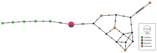 Median-joining haplotype network based on 702 bp of 28S rDNA from the newly sequenced individuals of Xenoligophoroides cobitis from Greece, and the sequences from Dmitrieva et al. [17]. Genotypes are represented by circles with the size of the circle correlating with the number of specimens displaying the respective genotype. Colors denote sampling localities; genotypes are connected with lines, indicating the number of mutations between them. Colors correspond to the sampling localities in Figure 4.