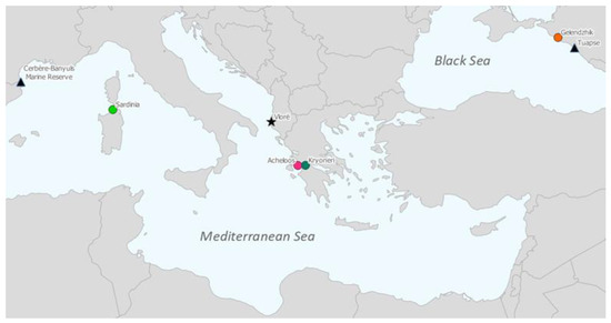 Distribution of Xenoligophoroides cobitis. Star: type locality, Gulf of Vlorë, Albania. Triangles: previously published records without accompanying genetic data (overview: see [17] and references therein). Green: population from northwestern Sardinia, Italy; orange: population from Gelendzhik, Russia, both sequenced by Dmitrieva et al. [17]. Pink: population from the Acheloos Delta, Greece; turquoise: population from Kryoneri Estuary, Greece, both sequenced in the present study. Colors correspond to those in the haplotype network (Figure 3).
