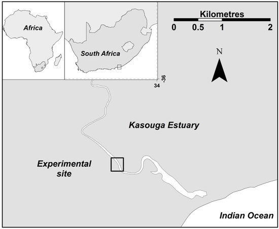 The mesocosm experiment was conducted during the closed phase of the temporarily open/closed (TOCE) Kasouga Estuary in the warm temperate zone along the south-east coastline of South Africa over a period of 9 consecutive days (4–15 September 2014; Figure 1). The estuary is approximately 2.5 km in length and is characterised by an extensive salt marsh on the east bank in the lower reaches of the system. Water depths in the estuary typically range from <0.5 m to 1.5 m, depending on the mouth state (open (estuary has breached) vs. closed (presence of a sandbar at the mouth which separates the estuary from the marine environment)) of the system. Surface water temperatures within the estuary range from 14 to 28 °C and demonstrate a strong seasonal pattern with maximum temperatures in summer and minimum in winter [24,25,26]. Due to the small catchment area (~49 km2) and sporadic rainfall, the system is generally regarded as oligotrophic, with salinities generally >25 (PSU). Following heavy rainfall within the catchment area, the system may become river-dominated, after which time the estuary normally breaches and becomes tidally dominated. Studies conducted within the estuary indicate that the total chlorophyll-a (Chl-a) concentration is <1.00 µg L−1, reflecting the low macronutrient availability as a result of sporadic/reduced freshwater inflow [24]. The zooplankton community is almost entirely (>95%) dominated, both numerically and by biomass, by calanoid and cyclopoid copepods of the genera Psuedodiaptomus, Paracartia and Oithona [2,25]. Total zooplankton abundances within the estuary are highly variable, reflecting changes in food availability and recruitment, and range from 1 × 102 to 1 × 104 individuals per cubic metre [24,25]. Like many of the TOCEs within this geographic region, the estuary represents an important nursery for a variety of marine and estuarine breeding fish species [21].