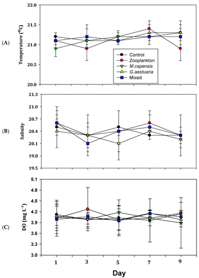The temperature, salinity and dissolved oxygen concentration were similar across treatments over the duration of the study (Figure 2A–C). The water temperature, salinity and dissolved oxygen concentration ranged from 20.9 to 21.4 °C, from 28.2 to 28.8 and from 7.29 to 7.68 µg L−1, respectively. There were no significant differences in the selected physico-chemical variables between treatments at the start of the experiment or between sampling days over the duration of the 9-day experiment (p > 0.05 in all cases).
