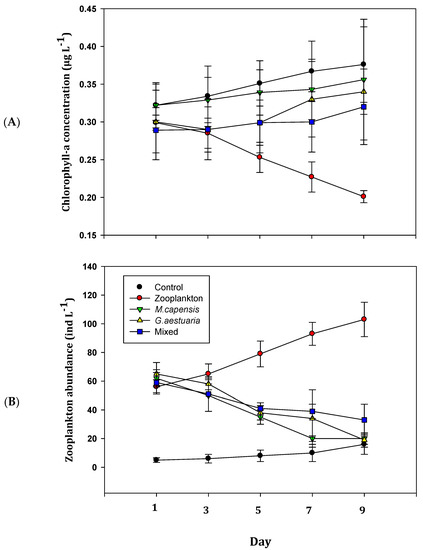 Ecological studies have long debated the relative importance of the “bottom up” (resource availability) and the “top down” (biological processes) control of aquatic ecosystems [35,36]. The salinity, temperature and dissolved oxygen concentration were consistent across treatments during the experiment (Figure 2A–C). The significant increase in the total Chl-a concentration observed in the absence of grazers (control) suggests that the effect of “bottom up” processes in accounting for the trends in total Chl-a concentration in the different treatments can be largely discounted. Studies conducted within the estuary [25,26] and in shallow-water ecosystems worldwide [37,38] have demonstrated the importance of copepods as grazers of phytoplankton production. The significant decline in total Chl-a concentration observed in the zooplankton treatment is, thus, not unexpected and highlights the importance of “top down” processes in structuring the phytoplankton community within the estuary during the study. The role of the copepods in controlling the primary production within the estuary is, however, likely to vary temporally in response to changes in the phytoplankton community structure [34]. During periods of reduced freshwater inflow, the low availability of macronutrients contributes to the phytoplankton community being too small be grazed efficiently by the larger copepods [25,34]. Under these conditions, the microbial loop represents the net sink for phytoplankton production.