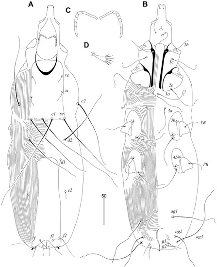 From each specimen, we examined about ten contour feathers (near the cloaca region), about five under tail coverts, and one small wing covert. Before mounting, mites were softened and cleared in Nesbitt’s solution at room temperature for three days, according to the protocol introduced by Walter and Krantz [25] and Skoracki [22]. Then, mites were mounted on slides in Hoyer’s medium and investigated using a light microscope (ZEISS Axioscope, Oberkochen, Germany) with differential interference contrast (DIC) illumination. Drawings were made using a camera lucida drawing attachment.