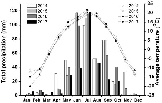 Field experiments were conducted in Houhatai country (42°23.613′ N, 116°06.524′ E, altitude: 1300 m), in south-central Inner Mongolia, China. The study site is a typical steppe area with a semi-arid climate characterized by warm summers and cold winters. the average monthly temperature ranged from −13.9 °C to 21 °C and the mean annual total precipitation was about 388.6 mm, ranging from 291.9.0 to 454.8 mm during the 2014–2017 period (Figure 1). Snow cover lasted from mid- or late October to early April the following year. All temperature and precipitation data were obtained from Zhenglan Qi Meteorological Station (ID. 54205), which is located about 25 km south of Houhatai country.