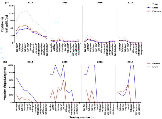 In total, 359 Mongolian gerbils (116 males and 137 females in 2014; 27 males and 26 females in 2015; 24 males and 27 females in 2016; 18 males and 13 females in 2017) were identified and captured 2457 times over 44 trapping weeks from 2014 to 2017. The MNAs fluctuated seasonally and annually (Figure 2a). The MNAs per trapping sessions in 2014 (average 92.2, standard error, SE = 8.6) was markedly higher than that in the other years (2015, 14.1 ± 1.5 gerbils; 2016, 11.4 ± 2.6 gerbils; 2017, 9.1 ± 3.1 gerbils; F3, 40 = 64.86, p < 0.001). From August to September 2017, only two individuals were captured on the trapping plot, and a few gerbils were live-trapped in a radius of about 5 km during the autumn of 2017 (W. Liu, unpubl. data). The annual mean sex ratios (females/total gerbils) ranged from 0.51 to 0.63 (Figure 2a). The reproductive performance of males and females varied seasonally during the 4-year study (Figure 2b). The monthly proportions of reproductively active males (PRM) were higher (average 0.49, SE = 0.07) between March and August and then declined toward autumn (average PRM 0.03, SE = 0.03) between September and October (Figure 2b). Reproductively active females were observed every half-month from March to August (PRF = 0.11 ± 0.03) but almost none were captured between September and October (Figure 2b).