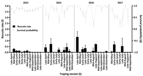Estimates of half-monthly survival probabilities and recruitment rates of Mongolian gerbils (Merionus unguiculatus) in Houhatai, Inner Mongolia, China, from April 2014 to September 2017. The estimates were generated using the full time-dependent survival and recruitment model [φ(t)p(t)f(t)]. Vertical bars are standard error (SE).