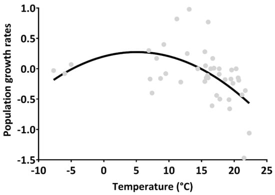 The most parsimonious and the two competing environmental-covariate Pradel-λ JS models (ΔAICc < 2.0, Table 2) had the population growth rate as a function of population density with a negative 95% confidence interval (CI) of the coefficient (−0.002) excluding zero (−0.002 to −0.0009), and as a function of precipitation with 95% CI of the coefficient including zero. Based on this, the second-best Pradel-λ model included the linear (coefficient = 0.032, 95% CI = −0.005 to 0.069) and quadratic (coefficient = −0.003, 95% CI = −0.005 to −0.001) terms of temperature, linear precipitation (coefficient = −0.005, 95% CI = −0.031 to 0.021), and population density (coefficient = −0.002, 95% CI = −0.002 to −0.001), with a ΔAICc and variable importance index (AICc weight) of 0.150 and 0.382, respectively (Table 2). The population growth rates (r) were also a quadratic function of temperature in the GLS regression (linear term: p = 0.107; quadratic term: B = −0.003, r2 = 0.296, p = 0.003; Figure 4), with an order-1 autocorrelative error index (Durbin–Watson statistic) of 1.64.