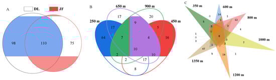 Venn diagrams showing the shared AMF OTUs between the two mountains (A) and at different altitudes on Mt. Diaoluo (B) and Mt. Jianfengling (C). Different colors represent different altitudes.