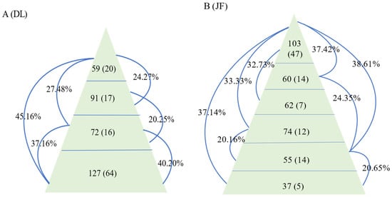 This study was conducted on Mt. Diaoluo (109°41′–110°40′ E, 18°38′–18°50′ N) and Mt. Jianfengling (108°44′–109°02′ E, 18°23′–18°52′ N) on Hainan Island, China. Mt. Diaoluo is one of the rarest and most precious primitive tropical rainforest areas in China. With increasing elevation, the vegetation types of Mt. Diaoluo proceed through tropical secondary forest, monsoon forest and evergreen broad-leaved forest, with a forest coverage rate of 96.26%. The annual average temperature of Mt. Diaoluo is 20.8 °C, and the climate is a tropical monsoon climate. Similar to Mt. Diaoluo, Mt. Jianfengling has a typical monsoon climate, with an average annual temperature of 19.7 °C and an average annual precipitation of 1300 to 3500 mm []. The vegetation types of Mt. Jianfengling are tropical semi-deciduous monsoon rainforest and tropical evergreen monsoon rainforest, with a forest coverage rate reaching 98%. Due to their special geographic locations and climates, the Mt. Diaoluo and Mt. Jianfengling areas are among the regions with the highest biodiversity levels in China.