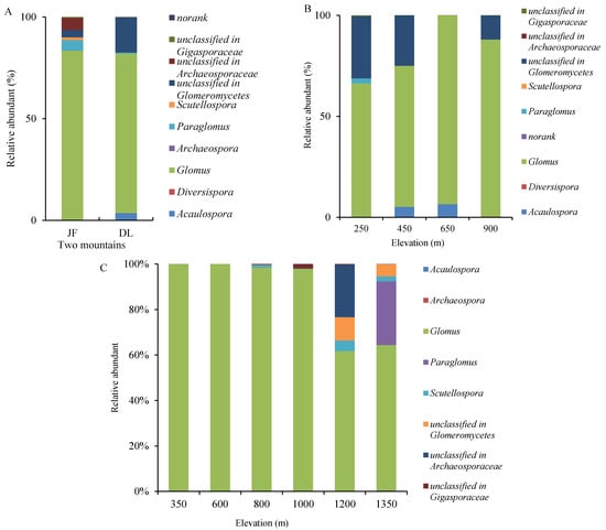 AMF genus relative abundances for the two mountains (A) and at different elevations on Mt. Diaoluo (B) and Mt. Jianfengling (C).