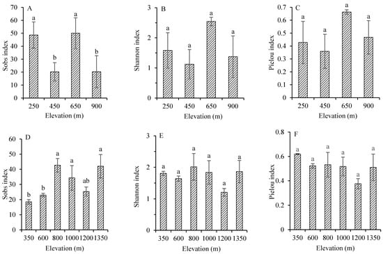 Differences in fungal diversity indices, including Sobs, Shannon and Pielou indices, on Mt. Diaoluo (A–C) and Mt. Jianfengling (D–F). Deviation bars represent standard errors. Different lowercase letters (a, b) above each column indicate significant differences (p < 0.05).