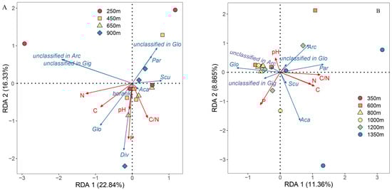 The interactions between soil microorganisms and plant roots were also found to be key factors shaping AMF communities, so these are important for understanding biodiversity patterns and ecosystem functions []. With increasing altitude, temperature and precipitation continued to drop, which led to changes in soil factors. Therefore, altitude probably determined AMF communities by affecting edaphic properties. In this study, the soil concentrations of C and N at the highest altitudes of 900 m and 1350 m were significantly higher than at other altitudes. Tashi et al. used a meta-analysis of global data to establish concentrations of C and N and found that total soil C and N contents significantly increased with altitude []. However, studies have shown that nutrient addition caused decreases in AMF diversity and abundance [,,]. Corresponding changes in soil factors have different degrees of impact on AMF community and diversity [,,]. Differences in concentrations of nutritional factors may lead to the loss of some fungal species and promote the dominance of certain AMF species []. In this study, the genus of Diversispora only occurred at the altitude of 900 m on Mt. Diaoluo. Moreover, RDA analysis showed that there was a significant correlation between soil P concentration and the occurrence of Diversispora. Gao’s study also showed that different phosphorus concentrations had significant impacts on AMF community structure []. Some studies have found that root systems can regulate symbioses with AMF according to their own nutritional statuses, which is called “self-regulation” [,]. When phosphorus supply is sufficient, roots directly absorb phosphorus from the soil. When the supply of phosphorus is insufficient, roots can undergo symbioses with AMF and thus facilitate hyphae to absorb phosphorus [,,]. Therefore, this also confirms that soil phosphorus concentration plays an important role in AMF community structure.