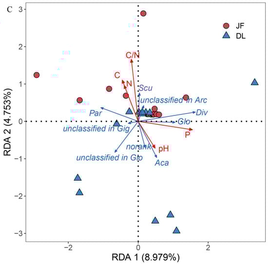 Graphical representations of the redundancy analysis (RDA) for AMF genera and soil properties of C, N, P, pH and C/N on Mt. Diaoluo (A), Mt. Jianfengling (B) and the two mountains (C). Genera: Aca (Acaulospora), Arc (Archaeospora), Div (Diversispora), Glo (Glomus), norank, Par (Paraglomus), Scu (Scutellospora), unclassified in Glo (unclassified in Glomeromycetes), unclassified in Arc (unclassified in Archaeosporaceae), unclassified in Gig (unclassified in Gigasporaceae).