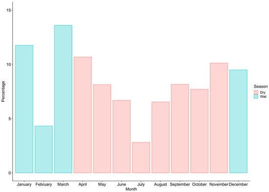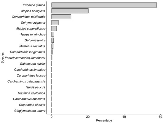 A total of 15,455 sharks (5508 males, 7788 females, and 2159 non-sexed) were recorded during 2019 in Manta (Table 2). Of the total number of sharks recorded, 3690 individuals (1739 males, 1934 females, and 17 unsexed) were measured, with an estimated biomass of 197.9 t (Table 3). The landed specimens were composed of nine families and 19 species. The most abundant families in number were Carcharhinidae (69.4%), Alopiidae (23%) and Sphyrnidae (4.9%). The most abundant species recorded during the sampling were P. glauca (57.9%), A. pelagicus (20.3%) and C. falciformis (10.7%) (Figure 1). During the 12 months of sampling, a greater abundance of sharks occurred during the dry season, representing 60.8% of the total caught sharks (Figure 2).