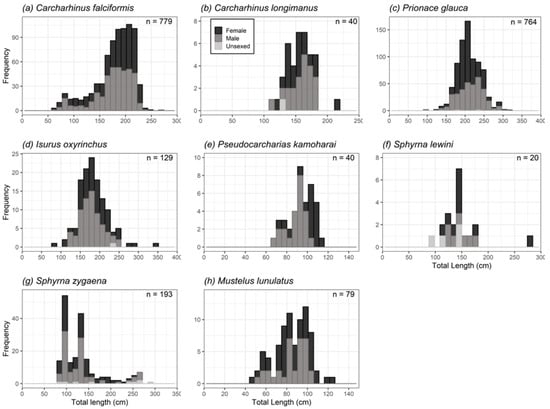 Composition of sizes of shark species (n ≥ 20) landed in Manta: (a) Carcharhinus falciformis; (b) Carcharhinus longimanus; (c) Prionace glauca; (d) Isurus oxyrinchus; (e) Pseudocarcharias kamoharai; (f) Sphyrna lewini; (g) Sphyrna zygaena; (h) Mustelus lunulatus.