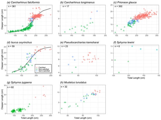 Relationship between the total length and the clasper length of the most abundant species: (a) Carcharhinus falciformis; (b) Carcharhinus longimanus; (c) Prionace glauca; (d) Isurus oxyrinchus; (e) Pseudocarcharias kamoharai; (f) Sphyrna lewini; (g) Sphyrna zygaena; (h) Mustelus lunulatus.