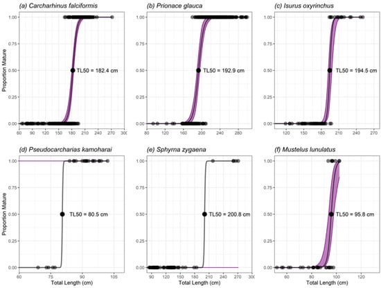 Length at maturity of male individuals of the main shark species landed in Manta: (a) Carcharhinus falciformis; (b) Prionace glauca; (c) Isurus oxyrinchus; (d) Pseudocarcharias kamoharai; (e) Sphyrna zygaena; (f) Mustelus lunulatus. The black dots in the middle of the curve correspond to the length at which 50% of individuals have reached sexual maturity (TL50). The black dots at the top and bottom correspond to mature and immature individuals, respectively. The purple shaded areas represent the 95% bootstrapped confidence intervals.