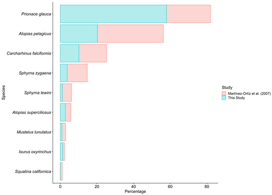 Approximately 64 shark species have been reported in Ecuador [16]. Between 2003 and 2006, Martínez–Ortíz et al. [17] documented 34 species of sharks in Manta. However, only 19 species were recorded in this study. This could be possibly due to the fact that the sampling in this study was only for one year, whereas that of Martínez–Ortíz et al. covered 3 years, although a possible loss of diversity as a result of increased fishing effort should not be discarded [7,57,58]. Sixteen years ago, Martínez–Ortíz et al. reported that the dominant species in landings in Manta was A. pelagicus, representing the 36% of the total species landed. However, in this study a decrease of 15.7% was observed, and Prionace glauca has become the dominant species in landings in Manta, with an increase of 33.9% (Figure 6). It is possible that these changes are due to overfishing and differences in the life history characteristics of both species. For example, P. glauca has an average of 30 offspring per litter [59], whereas A. pelagicus has only 2 offspring per litter [39]. C. falciformis remains in third place. However, it has suffered a decrease of 4.8%. In the case of vulnerable species, such as S. zygaena [60], and a critically endangered species, such as S. lewini [61], a decrease in landings is reported [17] (Figure 6). It is possible that this was related to the implementation of Ministerial Agreement 116, which allows Ecuadorian artisanal vessels to hold on board as bycatch a maximum of five hammerhead shark (juveniles up to 150 cm LT), which must have their fins attached to the body [62]. The season of greatest shark landings was the dry season (April–November). This could be due to 2 reasons, according to Martínez–Ortíz et al. [17]. First, the different type of fishing material and depth at which the hooks operate during the dry and rainy (December–March) seasons. Second, directed fishing at sharks due to the low abundance of target species during the dry season.