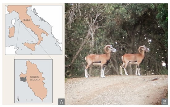 The Tyrrhenian mouflon, Ovis gmelini musimon (Pallas, 1811), is a medium-sized ungulate occurring in Sardinia and Corsica, where it was introduced by humans in the Neolithic [1,2,3,4]. In these Mediterranean islands, the species is protected by law. In the present paper, we follow the taxonomic definition of the species Ovis gmelini Blyth, 1841 [5,6]. Due to intense poaching and habitat loss, the Sardinian population suffered a dangerous census decline during the 20th century, which lasted until the 1970s [7], at which time it was estimated that just a few hundred individuals survived [8,9].