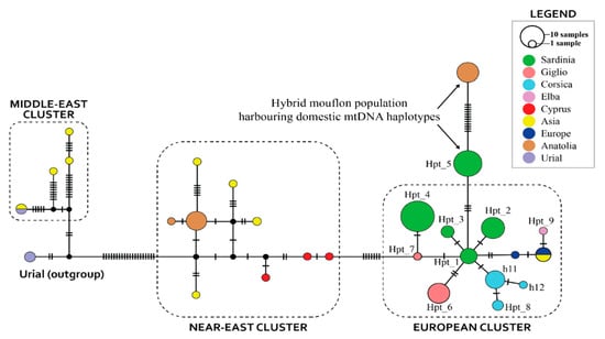 The median-joining network detected three main mtDNA haplotype clusters characterised by a strong geographical component (Figure 2). The 18 mouflon sequences clustered in five haplotypes (Hpt-6 to 9 and h11), according to the results inferred from the analysis of the genetic variability and haplotype diversity previously reported. Hpt-6 and Hpt-7 were found to be closely related to haplotypes Hpt-1 and Hpt-4, both previously described in the Sardinian mouflon [14], whereas Hpt-9 appeared closer to continental Europe mouflons.