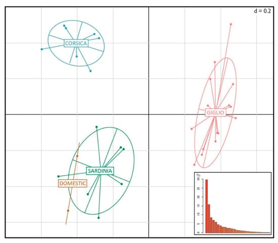 The PCA performed on SSR genotypes discriminated the dataset into three distinct clusters, overlapping with the geographic origin of the samples: Sardinia, Corsica, and Giglio Island (Figure 3), with the domestic individuals included within the Sardinian cluster. Importantly, we found ten Giglio individuals harbouring two private SSR alleles at two loci (MCM150-112 and MNS5-185; Table S1, Supplementary Materials).
