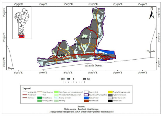 Adomou [32] distinguished three major phytochorological zones in Benin, namely the Guineo-Congolian and Sudanian regions, linked by the Guineo-Sudanian transition zone. The areas surveyed in this study (Ouidah, Abomey-Calavi and Cotonou) and located in Southern Benin and belong to the Guineo-Congolian phytochorological region. The Guineo-Congolian endemic genera such as Amphimas, Anthonotha, Distemonanthus, Hymenostegia, Anthrocaryon, Coelocaryon, and Discoglypremna were reported by Adomou [32]. The only Guineo-Congolian endemic family found in Benin is Octoknemataceae with Octoknema borealis (now in Olacaceae), restricted to the Phytodistrict of Ouémé valley. The natural vegetation of Southern Benin is dense dry semi-deciduous forest but is currently degraded [35]. With regard to the soil types of the surveyed areas, it is important to highlight that Southern Benin up to the latitude of approximately 6°50′ is dominated by the Terre de Barre, which is a ferralitic soil developed in the continental terminal [35]. The “continental terminal” constitutes part of the continental deposits which in Africa have a very large geographic extension and a high thickness. These deposits belong to all geological periods. They were formed from the Precambrian era and are still found in the Pleistocene. Similarly, Dossou-Yovo et al. [4] stated that the most significant soil types in the surveyed areas are sandy soils, hydromorphic soils, and ferralitic soils. Figure 1 highlights more details related to the vegetation and soil distribution in the study area. The climate of the surveyed cities is characterized by two rainy seasons, from April to July and October to November, and two dry seasons, from August to September and December to March [4]. They reported an annual precipitation ranging from 820 to 1300 mm, and the annual average temperature is about 33 °C.