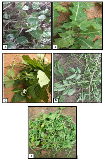 The plant materials used in the study are given in Figure 2. A. mexicana, belonging to the Papaveraceae botanical family, is an erect annual herb that grows up to 1 m with a long, slightly branched taproot. The stem is cylindrical to oblong, smooth, and pale greenish in color (www.prota.org accessed on 19 June 2022). The entire stem is covered with very short hairs and few long yellowish spines. It is named Houêtchégnon in the local language of Fon and worldwide is known as the Mexican prickly poppy, prickly poppy or yellow prickly poppy in English. The species is well known and is used as medicine in Benin as reported by de Souza [36]. A voucher specimen was also certified and deposited at the National Herbarium of Benin at University of Abomey-Calavi (Voucher Number: YH 519/HNB). H. indicum (Boraginaceae) is an annual, erect, branched plant that can grow to a height of about 15–50 cm (5.9–19.7 in). It has a hairy stem, bearing alternating ovate to oblong-ovate leaves. It has small white or purple flowers with a green calyx; five stamens borne on a corolla tube; a terminal style; and a four-lobed ovary (www.prota.org accessed on 19 June 2022). It is locally called Koklosou dinkpadja in thel Fon language, and worldwide it is known as Indian heliotrope, or Indian turnsole in English. The species is well known and medicinally used in Benin, as reported by de Souza [36]. A voucher specimen was certified and deposited at the National Herbarium of Benin at the University of Abomey-Calavi (Voucher Number: YH 520/HNB). K. foetidissima (Cucurbitaceae) is an herb with prostrate or climbing stems up to 3 m long, growing from a tuberous root. The plant is somewhat sticky and unpleasantly smelling when crushed. Leaves are narrowly to broadly ovate in outline (www.zimbabweflora.co.zw accessed on 19 June 2022). It is named Tchiôman or Donkpêman in Fon, a medicinal plant used in Benin for decades, as has been reported by de Souza [36]. A voucher specimen was also certified and deposited at the national herbarium of Benin at University of Abomey-Calavi (Voucher Number: YH 521/HNB). P. pellucida (Piperaceae) is an annual herb up to 0.4 m tall, its leaves are broadly ovate (egg-shaped) or ovate-triangular. It is branched, and its hairless stems are erect or rising upwards (https://www.nparks.gov.sg/florafaunaweb/flora/5/5/5557 accessed on 19 June 2022). The species is named Sinfama in Fon and is known worldwide as pepper elder, shining bush plant or man to man. It was also reported by de Souza [36]. A voucher specimen was certified and deposited at the National Herbarium of Benin at University of Abomey-Calavi (Voucher Number: YH 518/HNB). S. leptocarpa (Leguminosae-Mimosoideae) is a straggling perennial herb resembling the “Sensitive Plant” (Mimosa pudica) but with continuous not jointed pods (www.plants.jstor.org accessed on 19 June 2022). It is locally named Assoutowédja boyonoudo, is a medicinal plant used throughout Benin, and was reported by de Souza [36]. A voucher specimen was certified and deposited at the National Herbarium of Benin at University of Abomey-Calavi (Voucher Number: YH 522/HNB). All of these plant names with their photographs were checked with http://www.theplantlist.org (accessed on 19 June 2022).