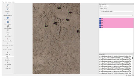After randomly selecting all images that did not contain half an animal from the cropped images, they needed to be labeled to generate the training data set. The software tool LabelImg was used to label Tibetan sheep, yaks, and Tibetan wild donkeys. The labeling process is shown in Figure 2. In this process, a corresponding XML format file was established for each image, in which the category of each target animal in the image and its corresponding location information were recorded.