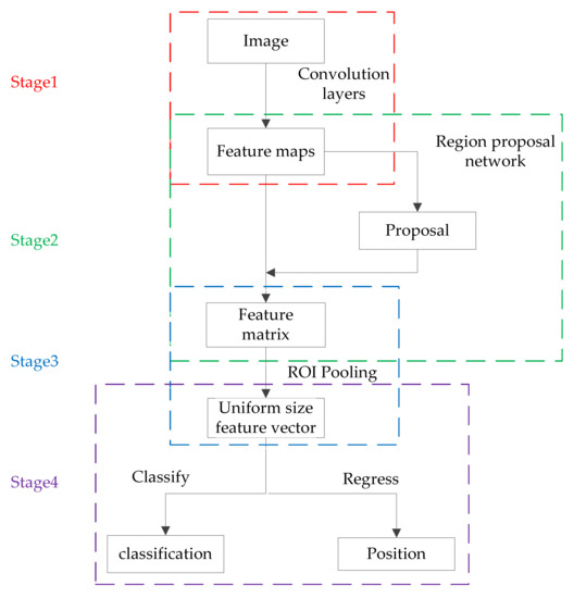 Faster-RCNN is a two-stage target detection algorithm where VGG16 is used as the feature extraction network. VGG16 includes 13 convolution layers and 3 full connection layers, and the convolution kernel size is 3 × 3 [25]. The VGG network conducts several down sampling processes in the process of extracting feature information, resulting in the small targets in the feature map having basically only single digit pixel sizes, resulting in a poor detection effect for small targets. The reasoning speed reaches 5 fps on GPU (including all steps) [10]. The algorithm process can be divided into four steps. (1) Feature extraction network. We input the image into the feature extraction network to extract feature maps. (2) Region Proposal Network (RPN). The RPN generated 9 anchors with 3 box areas of 1282, 2562, and 5122 pixels and 3 aspect ratios of 1:1, 1:2, and 2:1 at each position of the feature map [26] and sampled 256 samples in all anchor boxes to train the RPN network, in which the ratio of positive to negative samples was 1:1. On the one hand, it judged whether the category of anchor boxes belonged to the foreground or background through softmax; on the other hand, it calculated the regression offset of the bounding box to obtain an accurate candidate box and eliminate candidate boxes that were too small or beyond the boundary. After screening, the RPN finally retained 2000 candidate frames and projected them onto the feature map to obtain the corresponding feature matrices. (3) Region of interest pooling (ROI pooling). The feature matrices obtained from the RPN layer were mapped into uniform size feature vectors by ROI pooling. (4) Classification and regression. The feature vectors obtained by ROI pooling were transmitted to the classifier through the full connection layer to judge the category. Additionally, the more accurate positions of the detection frames were regressed by the regressor. The flow chart is shown in Figure 3.