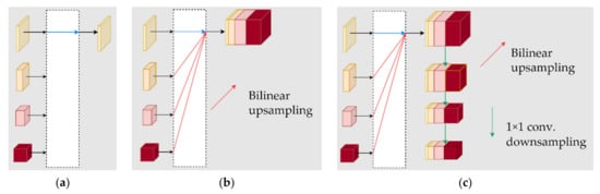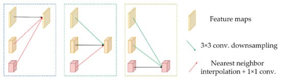 In this paper, HRNet (High-Resolution Net) was used as the feature extraction network. HRNet was originally proposed by Sun K and used in human posture detection tasks [21]. It tends to generate high-resolution feature maps. Its advantage is that it not only maintains high-resolution feature maps, but also maintains the information interaction between different resolution feature maps in a unique parallel way. In this way, a high-quality feature map is generated, which not only covers the semantic information of feature maps at different levels, but also maintains the original resolution. The main structure of the network is shown in Figure 4. It can be seen from the figure that the network is divided into four stages, of which the third stage has three sizes of feature maps and the fourth stage has four sizes of feature maps. Each stage has a feature map of one size greater than the previous stage, and the feature maps of different levels repeatedly interact with each other in different stages. After reaching the last stage, there will be convolution streams with four resolutions. HRNetV1 only outputs the highest resolution feature map, which is often used for human posture estimation. Its output representation is shown in Figure 5a. HRNetV2 connects all low-resolution feature maps with the highest resolution feature map after up sampling, which is commonly used for semantic segmentation and face key point detection. Its output representation is shown in Figure 5b. HRNetV2p [28] is a new feature pyramid formed by down sampling the output representation of HRNetV2. It is predicted separately on each scale and is commonly used for target detection. Its output expression is shown in Figure 5c. In this paper, HRNetV2p was used as the feature extraction network, and the HRNet mentioned in this paper used as the feature extraction network refers to HRNetV2p. The down sampling shown in Figure 4 and Figure 5 was realized by many 3 × 3 convolution filters with stride 2, and the up sampling was realized by the nearest neighbor algorithm and 1 × 1 convolution, as shown in Figure 6.
