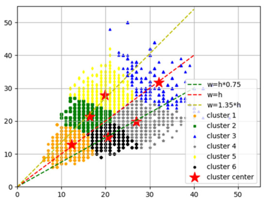 The Region Proposal Network module of the original Faster-RCNN generates 9 anchor frames with 3 box areas of 1282, 2562, and 5122 pixels and 3 aspect ratios of 1:1, 1:2, and 2:1 at each position of the feature map [27]. We selected the correct detection boxes from these anchor frames and adjusted their position and size to finally complete the detection of the target. The size of large herbivores in the UAV images ranged from 5 pixels to 50 pixels. The anchor frame size generated by the original algorithm was not suitable for large herbivores. In this paper, the size of each training sample was calculated by reading the coordinates (xmin) and (ymin) in the lower left corner and (xmax) and (ymax) in the upper right corner of the target in the annotation file. Then, the K-means algorithm was used to cluster the sizes of all training samples to obtain the sizes of six clustering centers. The clustering results are shown in Figure 7, in which the abscissa is the height of the annotation box and the ordinate is the width of the annotation box.