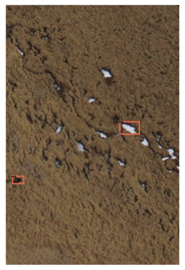 In the classification and regression phase of the original Faster-RCNN algorithm, after the detection frames were generated, the detection frames needed to be filtered again to eliminate some wrong detection frames. By observing the detection results, it was found that no matter whether the feature extraction network was replaced or the anchor frame size was modified, there were false detections in the detection results where snow was recognized as Tibetan sheep, rock, or shadow or where other backgrounds were recognized as Tibetan wild donkeys. Additionally, the size of these false detected backgrounds was usually inconsistent with the target. As shown in Figure 8, too-small and too-large detection frames were usually formed by the false detection of some confusing backgrounds. After screening, the detection accuracy could be improved. Therefore, we optimized the post-processing stage. With the help of python, we calculated that the size range of the target was between 5 pixels and 50 pixels. So, we eliminated the detection frames with a score of less than 0.5 and the detection frames with lengths or widths less than 3 pixels and lengths or widths greater than 55 pixels at the same time, so as to reduce the number of false alarms during detection. After screening, the detection accuracy could be improved.