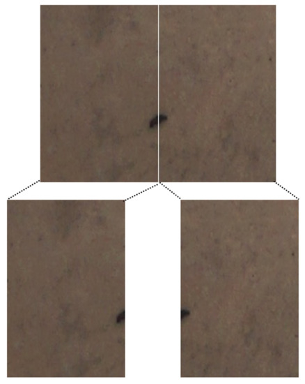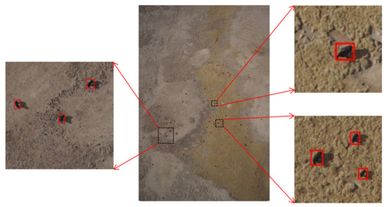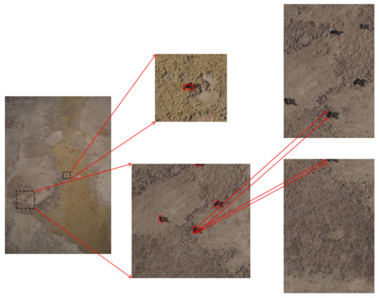 As the whole UAV image was too large, its size did not match the size required by the model. During training, we divided the image equally for training. When using the model to detect the whole UAV image, it was also necessary to divide the image into small blocks. After the detection frames of each block were obtained, these detection frames were mapped to the original image. The method of bisection segmentation was usually used for detection, but if a whole remote sensing image was evenly divided into small images for detection, this may cause the problem of false alarms or missed detection. As shown in Figure 9, if a yak is divided into two halves in the segmentation, both parts of the body may be detected or not detected, resulting in false alarms or missed detection.