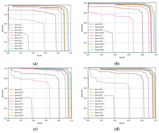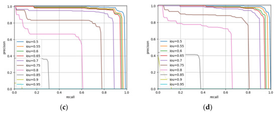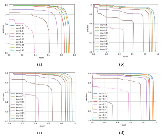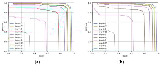 where Bop represents the prediction box, Bgt represents the ground truth, area (Bop ∩ Bgt) represents the intersection of the prediction box and the ground truth, and area (Bop ∪ Bgt) represents the union of the prediction box and the ground truth. The higher the IoU value is, the more accurate the detected box will be and the smaller the difference between the box and the ground truth will be. In this paper, PR curves constructed under different IoU values were compared. Finally, a threshold with an IoU of 0.5 was selected. If the IoU between the detection frame and the ground truth was greater than 0.5, the detection frame was considered to be the correct prediction frame.