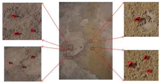 When training the model, we divided the image equally. When using the model to detect the whole UAV image, we also needed to divide the image into small blocks, and map back to the original image after obtaining the detection frames of each block. In order to verify the effectiveness of the proposed new overlapping segmentation method, we used the best model trained by modifying the size and proportions of the anchor frame and used NMS to eliminate the detection frames that did not fall within the range to detect the whole UAV image. The bisection segmentation, the original overlapping segmentation, and the overlapping segmentation method proposed in this paper were used to test the image. Figure 15 shows the result of detection conducted using bisection segmentation, Figure 16 shows the result of detection conducted using the original overlapping segmentation method, and Figure 17 shows the result of detection conducted using the new overlapping segmentation method.