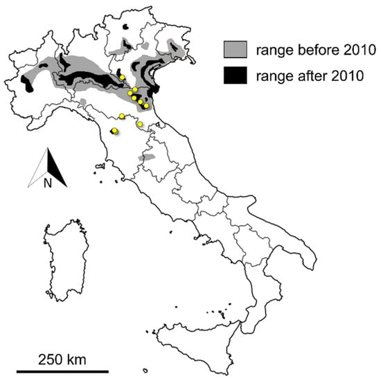 Past (2000–2010) and present (2010–2022) distribution of Micromys minutus in Italy [,,]. Yellow dots represent sampling sites. As to Central Tuscany (Padule di Fucecchio), first records date back to 1990s and have been recently confirmed [].