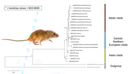 Although traditional taxonomy identifies 20 subspecies [], only four clades can be confirmed: the one including most Italian samples, the one including the rest of European (also comprising Padule di Fucecchio samples) specimens (commonly reported as Micromys minutus minutus), the one including South Korea + Japan samples (Micromys minutus hondonis), and the one including Russia + China + Taiwan samples (Micromys minutus takasagoensis) [,]. Apart from Central Italy individuals, the rest of the Italian group seems to diverge from the rest of Europe; however, this clade relies only on a few parsimony-informative nucleotides.