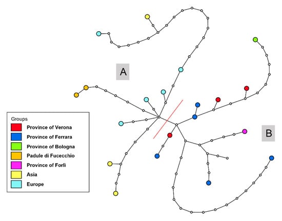 In the phylogeographic network, two haplogroups could be identified: (A) including all Italian sequences, except for Padule di Fucecchio samples; (B) including all the other Eurasian samples (Figure 3).