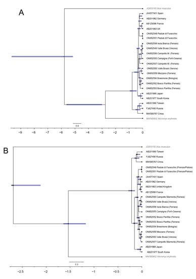 Italian populations showed levels of genetic diversity (i.e., nucleotide divergence = 0.0089; k = 7.773) larger than other European populations (π = 0.0003; k = 4.364) and smaller compared to Asiatic ones of Micromys minutus (π = 0.012; k = 12.54 []). However, genetic diversity values were comparable with (e.g., Gerbillus campestris, []; Apodemus agrarius []; other species []), or lower [,,] than those found in other rodents.