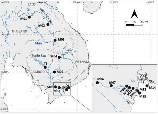 Durand, J.-D.; Simier, M.; Tran, N.T.; Grudpan, C.; Chan, B.; Nguyen, B.N.L.; Hoang, H.D.; Panfili, J. Fish Diversity along the Mekong River and Delta Inferred by Environmental-DNA in a Period of Dam Building and Downstream Salinization. Diversity 2022, 14, 634. https://doi.org/10.3390/d14080634