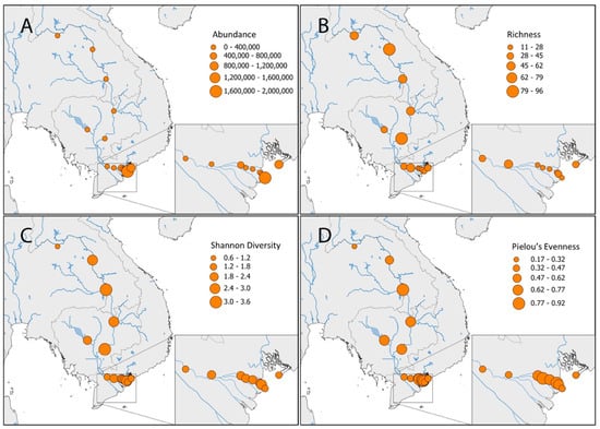 APA StyleDurand, J.-D., Simier, M., Tran, N. T., Grudpan, C., Chan, B., Nguyen, B. N. L., Hoang, H. D., & Panfili, J. (2022). Fish Diversity along the Mekong River and Delta Inferred by Environmental-DNA in a Period of Dam Building and Downstream Salinization. Diversity, 14(8), 634. https://doi.org/10.3390/d14080634