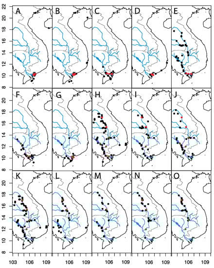 - Sokheng, C.; Chhea, C.K.; Viravong, S.; Bouakhamvongsa, K.; Suntornratana, U.; Yoorong, N.; Tung, N.T.; Bao, T.Q.; Poulsen, A.F.; Jorgensen, J.V. Fish migrations and spawning habits in the Mekong mainstream: A survey using local knowledge (basin-wide). In Assessment of Mekong Fisheries: Fish Migrations and Spawning and the Impact of Water Management Project (AMFC); AMFP Report, 2, 99; Mekong River Commission: Vientiane, Laos, 1999. [Google Scholar]