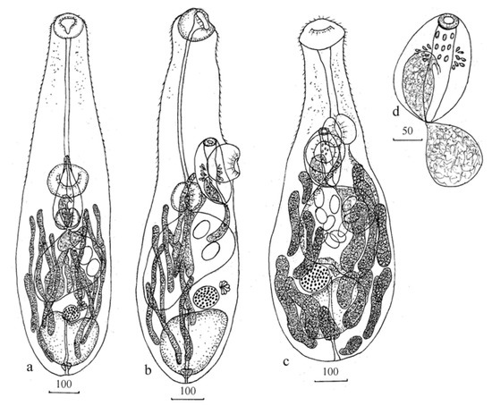 - Atopkin, D.M.; Besprozvannykh, V.V.; Ha, D.N.; Nguyen, V.H.; Khamatova, A.Y.; Vainutis, K.S. Morphometric and molecular analyses of Carassotrema koreanum Park 1938 and Elonginurus mugilus Lu, 1995 (Digenea: Haploporidae) Srivastava, 1937 from the Russian Far East and Vietnam. Parasitol. Res. 2019, 118, 2129–2137. [Google Scholar] [CrossRef]