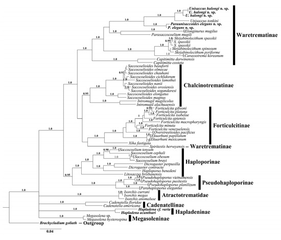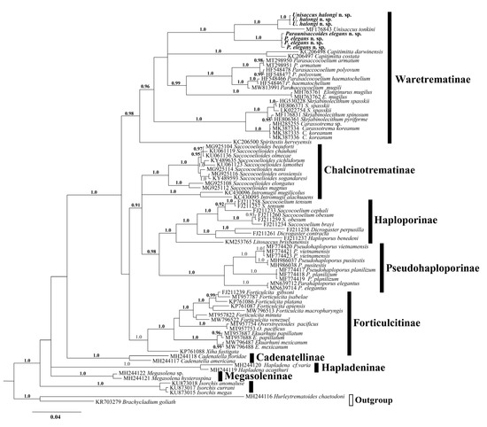 On the basis of the last known classification of Haploporidae, provided by Overstreet and Curran [1], Vietnamese worms belong to this family by morphological characteristics, including organ topology, single testis, identical hermaphrodite sac structure, and single caecum. The latter characteristic is representative for worms of the genera Paraunisaccoides within Haploporidae, as well as Unisaccus and Unisaccoides (Unisaccinae Martin, 1973, Haploporidae), validated by Martin [33,34]. In 2005, Paraunisaccoides and Unisaccoides were synonymised with Skrjabinolecithum Belous, 1954 (Waretrematinae), and the type genus Unisaccus of Unisaccinae was transferred to Haploporinae [1]. This has led to recognising Unisaccinae as a synonym of Haploporinae [1].