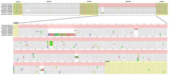 The sequences of ycf3 gene among nine Persicaria species. The yellow boxes indicate the exon and red boxes indicate the loss of ycf3 intron II.