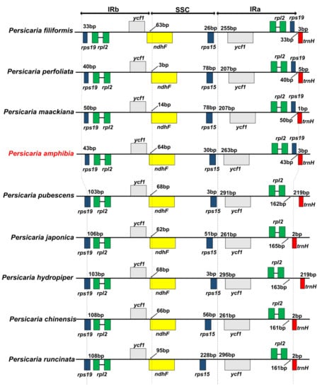 Comparison of the LSC/IR and IR/SSC junction among nine Persicaria cp genomes.